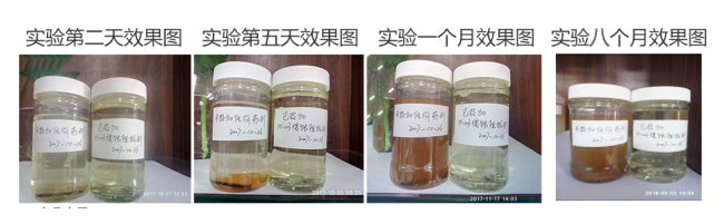 ②实验结果:隔天后便可观察到明显不同结果,很明显没投加保养药剂的铁钉已生锈,水变得浑浊,而有添加KY-103缓蚀阻垢剂的那一瓶自来水仍然很清澈,铁钉仍未见长锈,时间越长,效果越明显(如上图所示)。